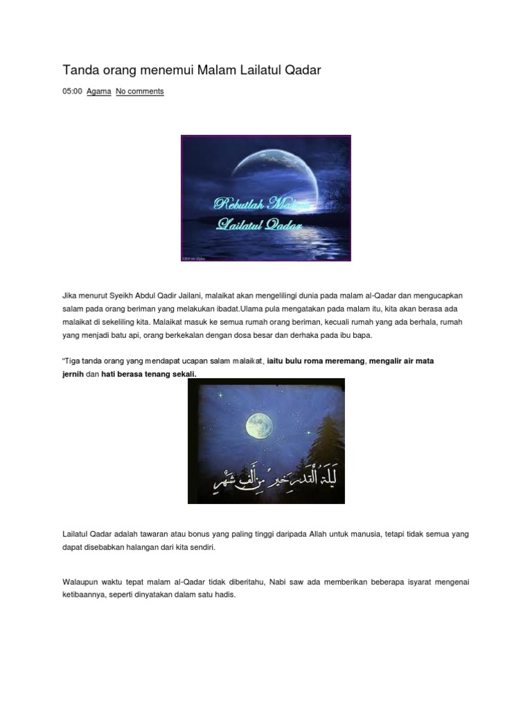 Malam qadar atau lailatul qadr (bahasa arab:لَیلَةُ القَدر) adalah malam diturunkannya alquran dan malam ditakdirkannya segala urusan dalam setahun mendatang bagi umat manusia. Meskipun lailatulqadar menjadi rahasia allah, umat islam diberi petunjuk untuk memprediksi kapan malam tersebut tiba, yaitu, keesokan hari setelah lailatulqadar, paginya suasana akan tenang dengan cahaya mentari yang redup (tidak. اللَّهُمَّ إِنَّكَ عَفُوٌّ تُحِبُّ الْعَفْوَ فَاعْفُ عَنِّي ya allah, sesungguhnya engkau.