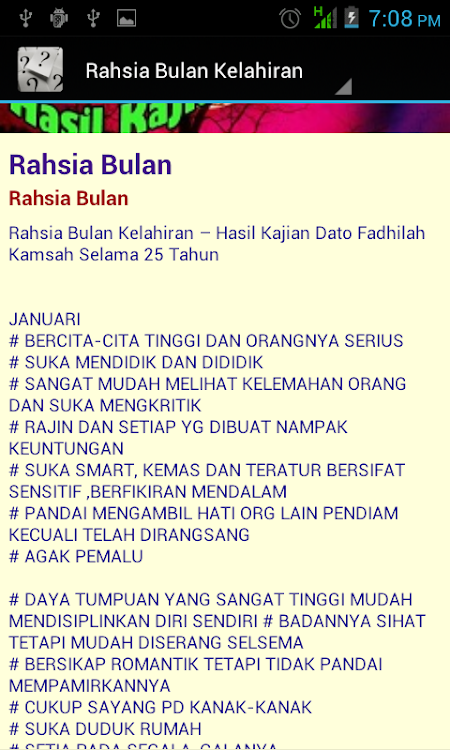Kita boleh tahu tarikh lahir kita dalam bulan islam dan boleh calculate berapa lama dah kita hidup kat dunia ini. Dengan tarikh lahir, kita mampu mengungkap rahsia di sebalik diri kita. Penjabaran dari rahsia tarikh lahir. Pasangan ideal untuk individu yang lahir dalam bulan januari selalunya dilahirkan dalam bulan 3, 6,8,11.