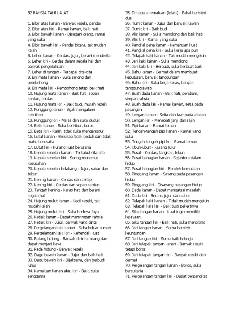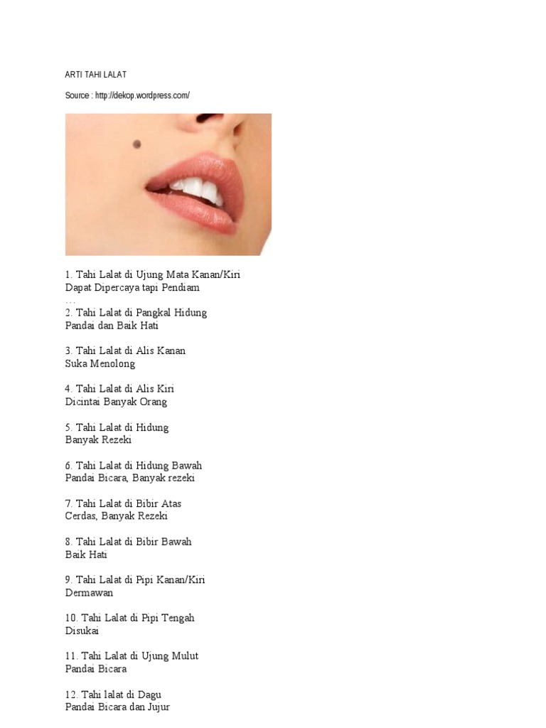 Bibir atas kiri = ramai kawan, baik hati 3. Menurut teori china kuno, tahi lalat di tubuh memberikan makna tersendiri, tidak semuanya buruk melainkan ada yang menandakan keberuntungan atau hoki. Jika anda mempunyai tahi lalat di sini, anda berbakat di bisnis.